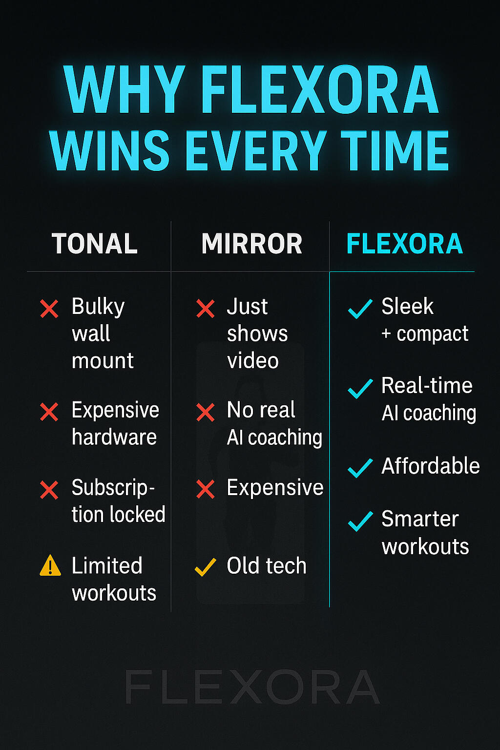 💸 FLEXORA is designed to be smarter and more affordable than competitors like Tonal and Mirror. Check current pre-order pricing at FLEXORA.fit.Q4: Is there a subscription?